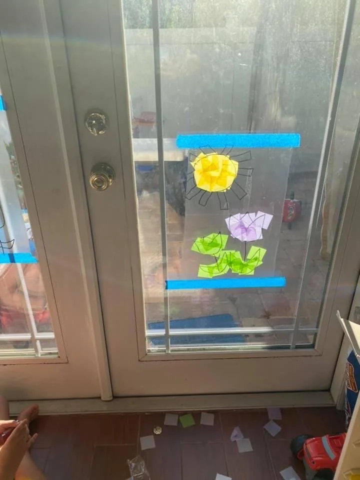 This one you will need contact paper and tissue paper squares. Let your child draw a scene on the non sticky side of the contact paper with black marker, then you want to tape the contact paper with the sticky side facing out(use painters tape) and then your child can place the tissue paper witin the scene they have drwan.After they have finshed placeing all the tissue paper you have a beaitugl “Stained glass” art piece.