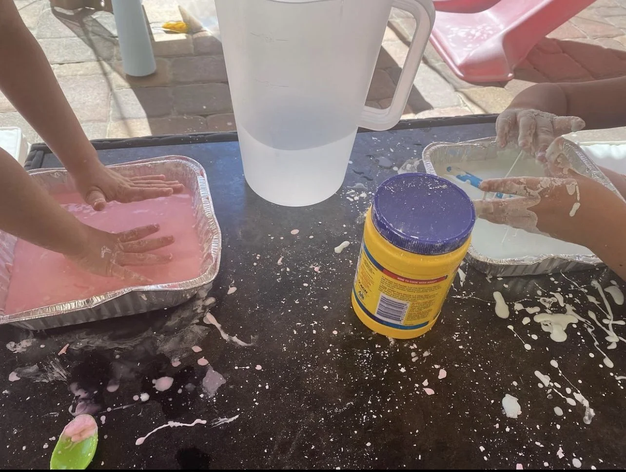 This one is MESSY so do it outdoors with a tarp or on a table. It’s cornstarch and water with a little food coloring but man on man is it messy!! The kids have a blast with it and you can learn a little bit of science behind this non-newtonian fluid. when pouring it, its a liquid but, when force is applied (My kids like punching it) then it becomes a solid The recipe is simple